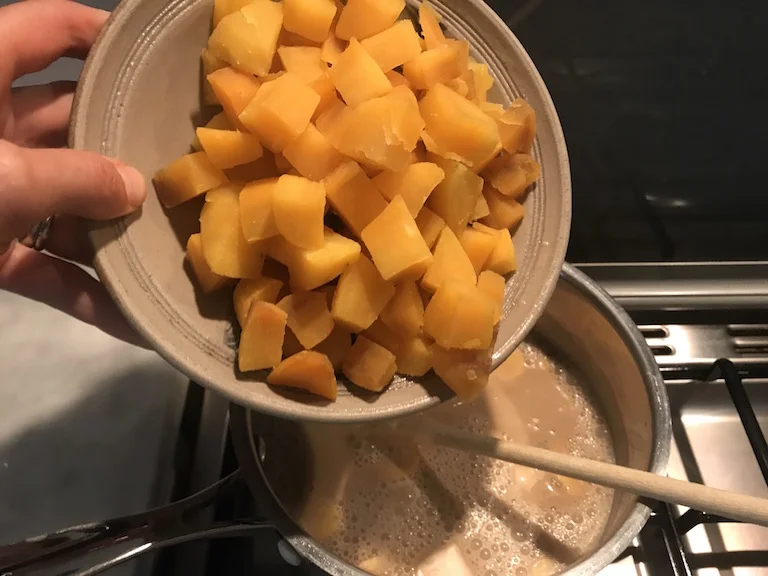 4. Add the sweet potato and banana. Bring to boil, stirring to maintain a smooth consistency.