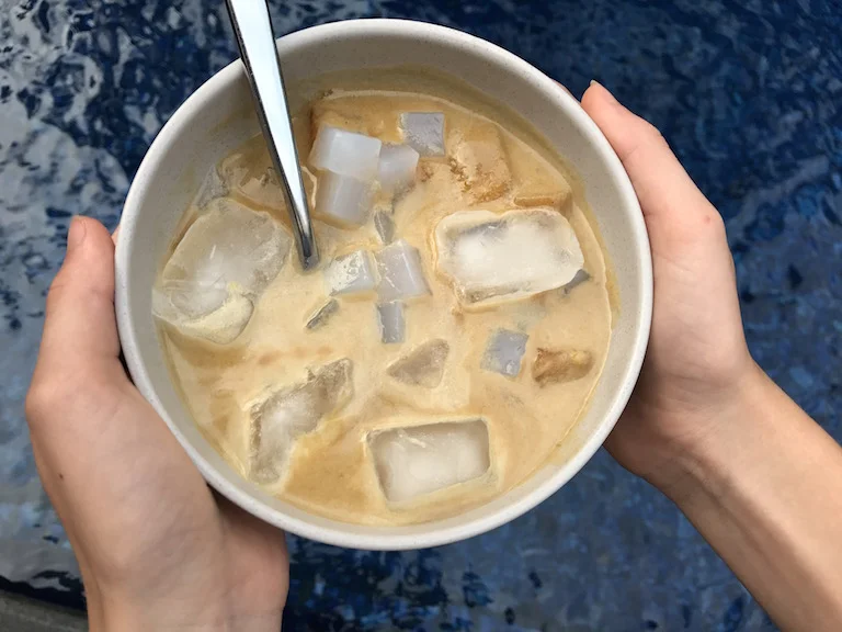 To make kolak a more refreshing snack, add cubes of ice and nata de coco - Or for a very local touch, add kolang kaling, which you can purchase from your local pasar. (Be sure to prepare it properly first before adding)