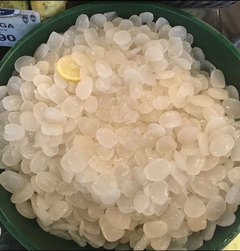 Kolang kaling are the immature fruit of the Aren palm (a type of feather palm). Before using, they need to be boiled in sugar syrup, then added to kolak and chilled.